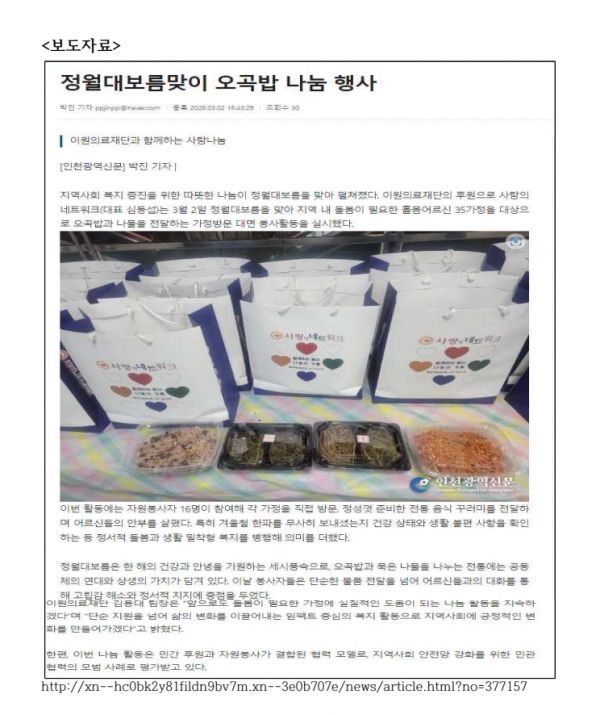 정월대보름 홀몸어르신 오곡밥, 나눔전달 > 보도자료
